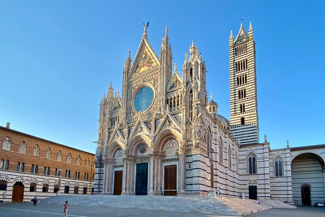 2) הדואומו של סיינה (Duomo di Siena) – איטליה התברכה בשפע של קתדרלות מפוארות ומרהיבות, והדואומו של סיינה היא ללא ספק מהיפות שבהם. היא מצופה מבחוץ ומבפנים בלוחות שיש לבנים המעוטרים בפסים שחורים המקנים לה מראה ייחודי. ביקור בתוך הדואומו הוא כמו ביקור במוזיאון. בפנים מוצגות יצירות של מיטב האומנים האיטלקים מתקופת הרנסאנס כדוגמת מיכאלאנג’לו, ברניני ודונטלו.