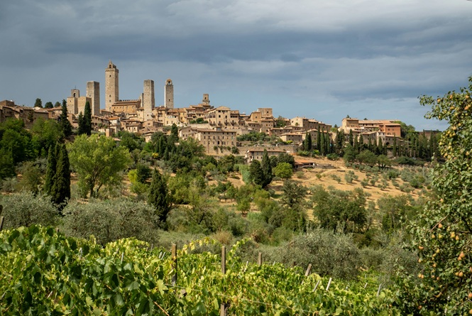 בעבר עיטרו את קו הרקיע של סן ג’מיניינו 72 מגדלים, 14 מהם עומדים עד ימינו. על הגבוה שבהם (60 מטרים) תוכלו לטפס כדי לתצפת על גבעות הפוריות המקיפות את היישוב. הן התפרסמו בכל רחבי איטליה עוד מימי הביניים בגידול של תבלין הזעפרן וגם בגידול של זן ענב לבן בשם Vernaccia. טוסקנה אמנם ידועה בעיקר ביינות האדומים שלה, אך יין לבן אסקלוסיבי זה היה אהוד מאד על שולחנם של מלכים ואפיפיורים, וגם בימינו זוכה לתהילת עולם (Vernaccia di San Gimignano).